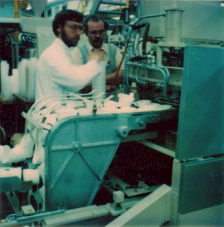 Gerard Treling en Jaap du Chatinier tijdens een SPPF trial; solid phase pressure forming voor de boterkuipjes, appelmoes bakjes enz