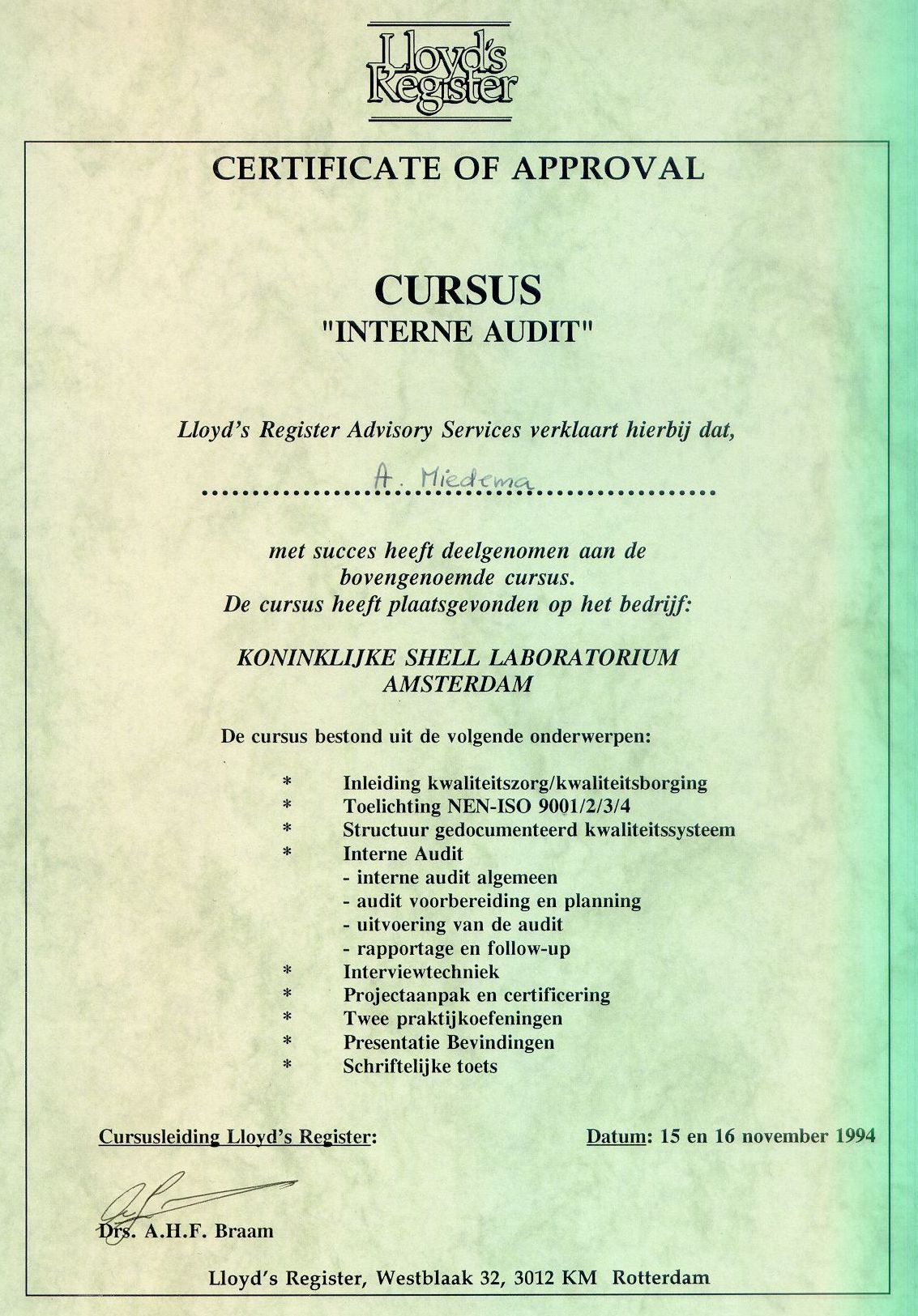 Programmeren in Basic en in Fortran, Extrusie (1978) en spuitgieten bij SORK (1979), geavanceerd spuitgieten bij BPTA in Telford (1998) en Extrusie bij Werner & Pfleiderer in Stuttgart 1999, Organometaal chemie, IR, NMR, Creativiteit, Rapportage, Basiscursus Gas Chromatografie 1987), vervolgcursus GC (1989), capillaire kolommen (1987), vacuümtechniek (1985), Mengen en Roeren (1999), Engineering (1999).